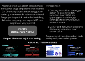 Khawatir dengan ancaman MBD (Metabolic Bone Disease)? Banyak kalsium di pasaran memiliki dosis yang tidak jelas. Asami Cal hadir dengan formulasi presisi yang dirancang oleh penghobi untuk penghobi. Kami memastikan reptil Anda mendapatkan tulang yang kuat dan saraf yang sehat tanpa risiko overdosis.