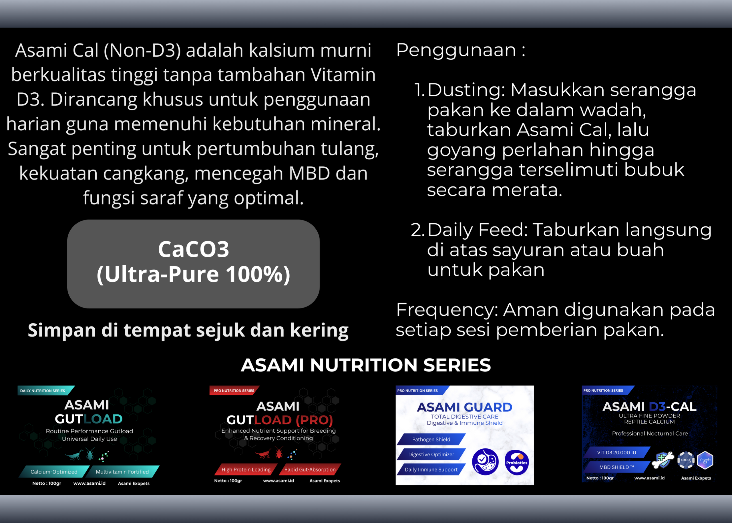 Khawatir dengan ancaman MBD (Metabolic Bone Disease)? Banyak kalsium di pasaran memiliki dosis yang tidak jelas. Asami Cal hadir dengan formulasi presisi yang dirancang oleh penghobi untuk penghobi. Kami memastikan reptil Anda mendapatkan tulang yang kuat dan saraf yang sehat tanpa risiko overdosis.